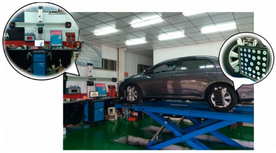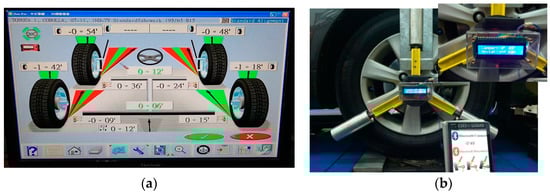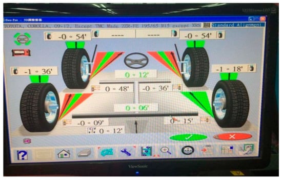 Figure 1 shows a typical computer vision-based inspection system for wheel alignments. Vision-based systems utilize images captured by video cameras and the image process algorithm to obtain main wheel angles. The target boards have to be mounted on the wheels before applying the system as the vehicle balances on the platform [,]. The vehicle must move on the platform for a certain distance while the system operates. Vision-based systems still have some drawbacks although the measurement procedure and the precision have improved. For instance, moving the vehicle on the platform may lead to hazardous conditions. Moreover, measurements take more time when mounting the target boards on the wheels since the mounting procedure, with extremely stable connections, requires a greater amount of attention if more precise results during the movement and rotation of the wheels are desired.