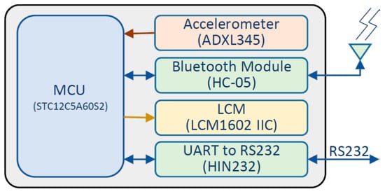 We mainly employed the MCU and the 3-axis accelerometer to realize the proposed approach. The accelerometer acquires the gravity in three axes while the MCU calculates the camber angle by the proposed approach. Figure 6 shows the function block diagram of the MCU-based camber inspection system. The type numbers of the MCU, the accelerometer, the bluetooth module, the liquid crystal display module (LCM), and the UART chip are STC12C5A60S2, ADXL345, HC-05, LCM1602 IIC, and HIN232, respectively. This paper implements the MCU-based camber inspection system, as shown in Figure 7, for the pilot study and the verifications of the proposed approach.