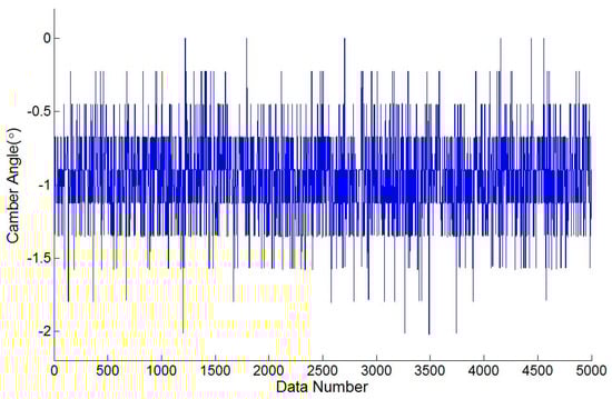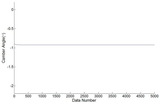 During an authentic camber angle inspection, for instance, Figure 8 shows the raw measured data of a front-right wheel from a vehicle with a camber angle of evaluated by the vision-based system as shown in Figure 9. The evaluated camber angles are available if the standard deviations of constant number data are within a specified value, e.g., . The deviation calculations are feasible since the update rate of the proposed camber inspection system is about 350 measurements/s. Let N be the number of data, be the i-th evaluated camber angle, be the mean of the N evaluated camber angles, and be the standard deviation of these N evaluated camber angles. The following definition is formed: