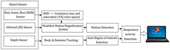 System overview. The proposed system includes a Kinect sensor connected to a laptop via Microsoft Kinect adapter; a real-time system based on motion magnification and motion detection; and software built-in Kinect library, including body index and skeleton tracking.