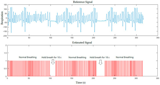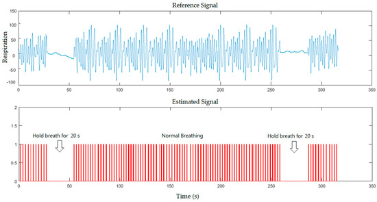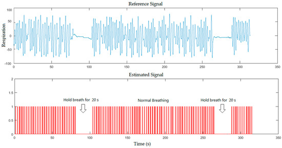 The experimental results obtained from five subjects at many positions were set in two scenarios. The first scenario is when the experiments were carried out in a more-lit environment. The frames sequence in this state obtained from RGB sensor were processed through the proposed system. The second scenario is a less-lit environment (or dark environment). The frames sequences in this state obtained from IR sensor were processed. The experimental results for both scenarios were implemented with and without a blanket. Because all participants in this study are apparently healthy, we asked the participants to hold their breaths during the measurement to create a situation mimicking Apnoea. In the first scenario, the real-time breathing simulation signal based on frame sampling time of five minutes was compared to the reference signal for healthy subject, where the subject was asked to hold his breath for 10 s and 18 s during the measurement in a normal illumination level as shown in Figure 5.