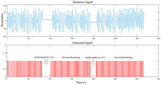 The breathing simulation signal against the reference signal is also shown in Figure 6 when the subject was covered by a blanket and asked to hold his breath for 18 s and 10 s during the measurement in the same illumination level.