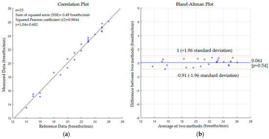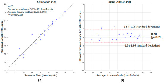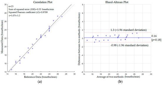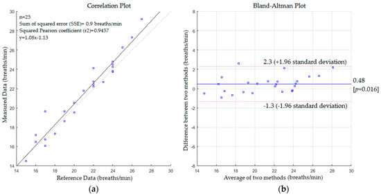 The statistical analysis based on correlation plot and Bland-Altman method [57] was used to measure the variability of the proposed system with the reference method. The respiratory data was assessed by recording the spontaneous respiratory signal for each subject using a Piezo respiratory belt attached to PowerLab-based computer (ADInstruments, NSW, Australia) which performs analogue to digital conversion and recording of the time-series signal. The respiratory rate values obtained by the Piezo respiratory belt were extracted by calculating a number of peaks in the time-series signal and used as references to compare with those obtained by the proposed system at the same time. The agreement was evaluated using the mean difference (bias) between the measurements, and the 95% limits of agreement (bias ± 1.96 SD) where SD is the standard deviation of the mean of the differences in paired measurements. The statistical analysis based on correlation plot and Bland-Altman method for respiratory rate measurements in the first scenario without a blanket is shown in Figure 9.