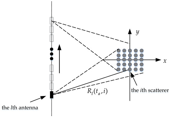 where gl(i) is the backscattering amplitude of the i-th scatterer (i.e., the i-th element in g l ), and Rl(ta,i) is the distance from the i-th scatterer to the antenna of the l-th channel at azimuth time ta. The imaging geometry is shown in Figure 1.