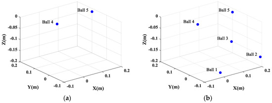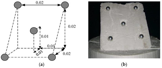 Figure 3. Target model of five metal balls. (a) 3-D spatial distribution; and (b) the photo in the anechoic chamber.