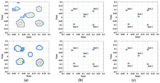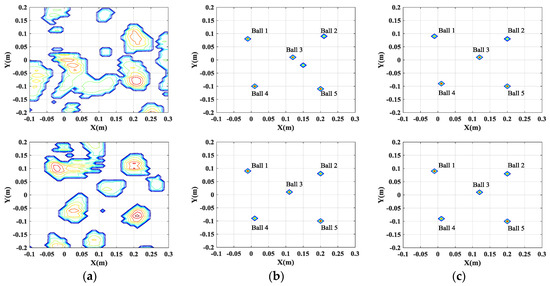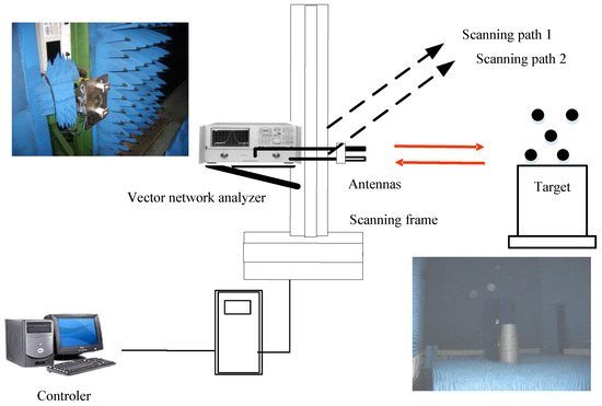 The target model of five metal balls is shown in Figure 3. According to the anechoic chamber existing condition’s foundation, the InSAR hardware-in-the-loop system is constructed, as shown in Figure 3. The movement of the scanning frame along a slide guide simulates the flight trajectory of airborne SAR. Two closely consecutive scanning paths are used for the simulation of two closely separated antennas in the InSAR system. Figure 4 shows the target model of five metal balls. The test parameters are listed as follows: the vertical distance between the scanning path and the target is 2 m, the center frequency is 10 GHz, the baseline length between two scanning paths is 0.02 m; the system bandwidth is 4 GHz, the step size of the frequency is 40 MHz, the width of the scanning path is 1 m and there are 51 sampling points.