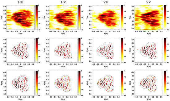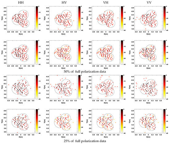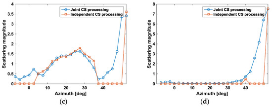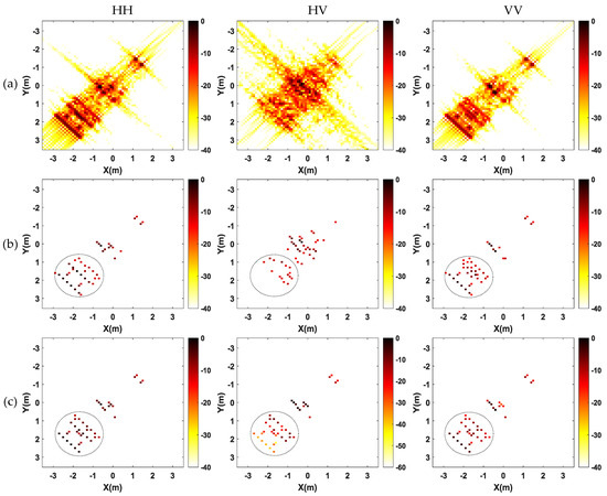 Figure 10 shows the comparison of full polarization SAR imaging results obtained by different methods. It is apparent polarization that full polarization SAR images generated by conventional FBP method are of low resolution and have high sidelobes, leading to difficulty in target identification. However, results generated by CS methods (both single channel CS and multichannel joint CS methods) show higher resolution and much less sidelobes. As shown in Figure 10b, the single channel CS independent processing cannot guarantee that the dominant scatterers are present in the same pixels among the generated SAR images from different channels, leading to deteriorate the cross-channels information. In contrast, by exploiting the joint sparsity property of the multichannel signals, the multichannel joint CS method can realize joint high-resolution imaging and cross-channels information preservation, effectively improving the recovery accuracy of scatterers, as shown in Figure 10c.