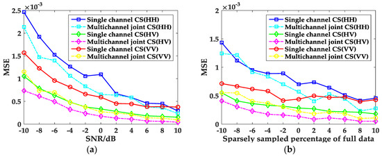 Next, the performance of the proposed method at varying noise levels and with different sparse samples will be discussed. In order to show the performance of the proposed method in the presence of noise, SNRs ranging from −10 to 10 dB are tested with 50 trials carried out at each SNR level. In a similar way, different sparsely sampled data are tested with 50 trials for each sampled data, so as to test the performance of the proposed method when sparsely sampled data are used. For each SNR and sampled data, the mean square error (MSE) of the amplitude for each channel is calculated and depicted in Figure 11. It can be observed in Figure 11 that when the SNR and the sampling ratio increases, the MSE of the amplitude for each channel quickly decreases; multichannel joint CS method can reconstruct full polarization SAR images with fewer measurements and have stronger suppression capability than the single channel CS method.