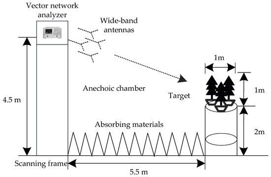 Experimental results are presented with the usage of real data acquired in the anechoic chamber to demonstrate the validity of the proposed method. As shown in Figure 12, the PolSAR hardware-in-the-loop system consists of a scanning frame, a vector network analyzer, four wideband antennas, and the scene including three trees. The movement of the scanning frame along a slide guide simulates the flight trajectory of airborne SAR. During the data acquisition, four antennas are employed with two transmitting horizontal (H) and vertical (V) polarization waves, and the other two receiving H and V polarization returns, which is shown in Figure 13a. It should be noted that due to the hardware limitation, the polarimetric measurement is not simultaneous, which means that the polarization waveform is alternately transmitted between H and V polarization, that is, first H polarization, then V polarization, etc. When the H polarization waveform is transmitted, the echoes of HH and HV polarization channels can be obtained simultaneously. When the V polarization waveform is transmitted, the echoes of VH and VV polarization channels can be obtained simultaneously. The whole observed scene in the anechoic chamber is shown in Figure 13b. Significant system parameters are given in Table 3.