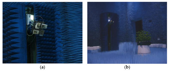 Figure 13. Photos of the PolSAR system in the anechoic chamber. (a) Antenna layout; and (b) the whole scene.
