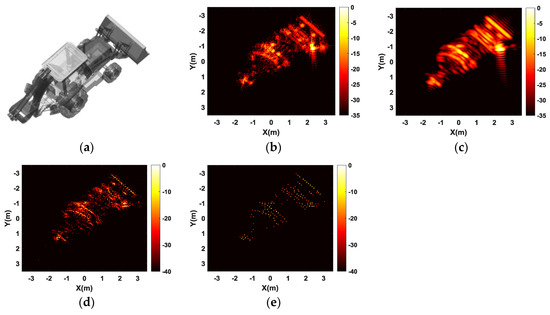 Figure 16. Comparison of imaging results by different imaging methods. (a) The backhoe CAD model; (b) FBP method applied on the full aperture of 65°; and composite images of (c) FBP method; (d) independent CS reconstruction and (e) joint CS reconstruction of 22 images each corresponding to a sub-aperture of 5°.
