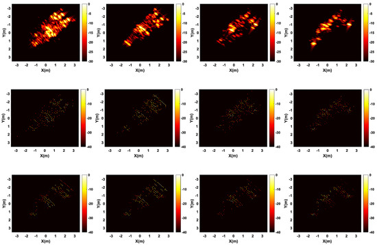 Figure 17. Three method’s reconstructed SAR images each of 5° width with maximum number of measurements. Columns left to right correspond to images centered at −7.5°, 2.5°, 15°, 27.5° degrees azimuth. Rows correspond to FBP method (top row), independent CS processing (middle row) and joint CS processing (bottom row).