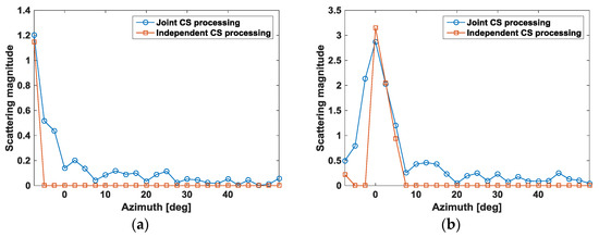 Comparing Equations (12) with (14), the difference between the independent CS processing and joint CS processing methods lies in the sparsity-constraint term. Independent CS processing aims to minimize the sparsity-constraint term according to the sparse property of the signal in a single channel or sub-aperture, but it cannot guarantee the nonzero pixels present on the same positions in the different recovered high-resolution SAR images. In contrast, exploiting the joint sparsity characteristic of multichannel or multi-aspect signals, the sparsity-constraint term in the joint CS processing method minimizes most elements in the same locations from the measurements. As a consequence, the recovered SAR images in different channels or sub-apertures share the same number and locations of the scatterers and more valuable scattering information can be preserved during the imaging process.