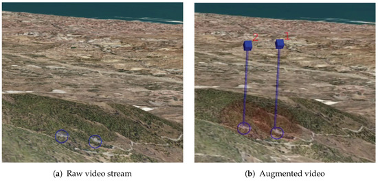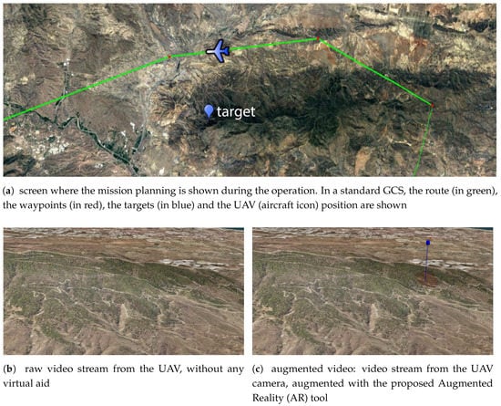 Finally, Figure 11 illustrates the difference between having the raw video stream and the augmented one. The images in this figure show how difficult it is for the operator to know if there are visible targets in the video stream. As it can be seen, the proposed tool significantly benefits the target search. The benefits of the tool have been validated by the GCS experts of Airbus. Their comments have been considered in order to improve the tool because they are aware of the operator needs. For further validation, the AR tool could be tested by UAV operators under some experimental cases in order to provide objective time search measurements.