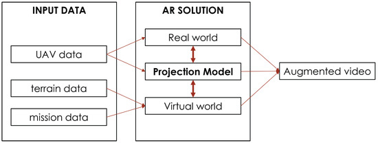 The system is structured in three different modules, as it is shown in Figure 2. One of the main parts of the system is that of input data processing; this module encompasses the processing of data coming from the UAV and the information available in the GCS. The AR solution module comprises the information of both real and virtual worlds as well as the establishment of the relationship between them to achieve visual coherence of the whole. Finally, the augmented video module is where the semantic meaning of the virtual elements is explained.