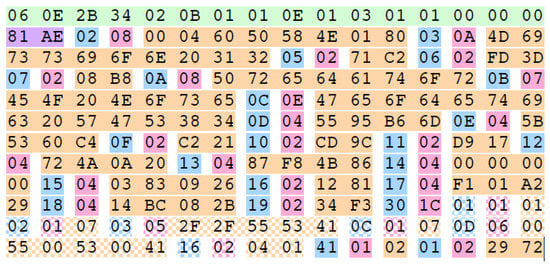 Example of a metadata Key-Length-Value (KLV) packet. It is formed by a key (in green), the length of the whole packet (in purple), and a sequence of metadata. Each metadata is identified by a tag (in cyan), the length of the data (in magenta) and the information itself (in orange). Grid patterned colors have the same meaning as the solid colors [15].