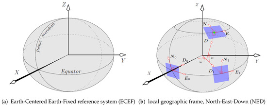 The local geographic reference system used by the UAV is defined by the gravity direction and its perpendicular plane (i.e., plane parallel to the ground). It is called the North-East-Down (NED) system and is shown in Figure 4b. As it can be observed, a plane tangent to the Earth spheroid contains the North and East directions, and the Down (i.e., gravity) is normal to this plane. The center of this local geographic reference system coincides with the position of the sensor in the world. As illustrated in Figure 4b, the NED frame is constructed in two steps, by applying the longitude (ω) and latitude (α) rotations to the NED frame defined by the vectors