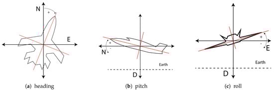 Next, the rotation of the UAV with respect to the NED system is performed (Tags 5–7 in Table 1). The rotation angles of the platform are illustrated in Figure 5. First, the heading is rotated around , ; then, the pitch is rotated around the rotated , , and, lastly, the roll angle is rotated around the latest rotated (i.e., ), yielding .