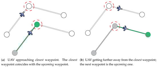 Figure 6 illustrates the initialization process. The first step in this stage is determining the closest waypoint (highlighted with a dash red circle), , to the current position of the UAV (in blue). Once this is known, the next step is distinguishing whether the UAV is getting closer or getting further away from . If the UAV is getting closer, as it is shown in Figure 6a, is the upcoming one, so and the leg are rendered in green. Otherwise, if the UAV is getting further away, as it is illustrated in Figure 6b, is set as visited (in gray) and the next one, , is set as the upcoming one, so that the leg shown in green is . Finally, when the upcoming waypoint is identified (i.e., the green one is selected), the previous ones in the route are settled as visited (in gray) and the others as non-visited (in white). During the standard case of use, a waypoint changes from upcoming to visited when the UAV is in a sphere of a predefined radius centered in the waypoint.