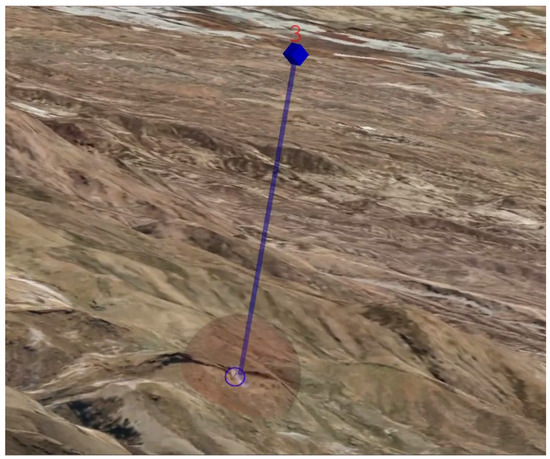 The targets are represented, as it is illustrated in Figure 7, using four different virtual entities: a cylinder, a cube, a label and a semi-transparent sphere. The cylinder represents a post that starts at the target position and ends at the same latitude and longitude but with a higher altitude. At the top of the post, a cube is added to highlight where the targets are. Both the cylinder and the cube are colored in blue. Additionally, next to the cube, a label that contains information of the specific target is shown in red. This allows the operator not only to distinguish where the targets are, but also to identify them. Finally, a semi-transparent red sphere is displayed at the bottom of the post. This sphere encloses the part of the image where the target should appear, and it is used to represent a region of uncertainty around the target.