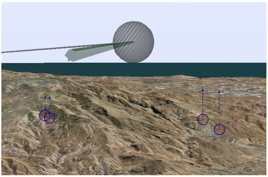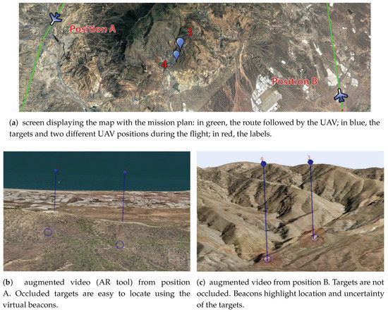 During the mission, the operator is in charge of identifying four targets, which correspond to four buildings. Figure 10 illustrates how some of such targets are seen from different positions along the UAV route. In Figure 10a, the map with the route (in green) is shown. In the middle of the map, two targets labeled with “3” and “4” are depicted in red. The operator should find these targets with the camera. However, in this example, the targets are placed over a mountainous terrain. Thus, an appropriate point of view should be found. The results from two different UAV positions are shown in Figure 10b,c. The targets seen from “position A” are displayed on Figure 10b: the operator can infer from the image that the targets are occluded by the terrain because the post beacons do not end in semi-transparent red spheres; they end with the shape of the mountain. With this information, the operator is aware of the fact that the camera zoom is not going to improve the visibility, hence another point of view is needed. In contrast, the augmented video observed from “position B”, displayed in Figure 10c, allows the operator to note that such a position is appropriate to distinguish the targets since they are not occluded. In such a case, the semi-transparent red spheres are shown at the end of the posts, which indicate that the targets are visible from that point of view. Therefore, the target inspection can be carried out from that perspective.