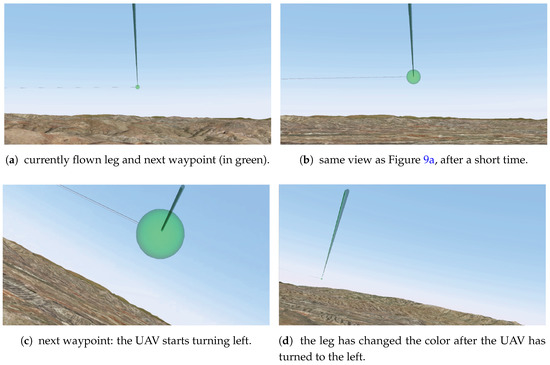 Figure 9 shows four different frames of the video stream, augmented with the route during the flight. In Figure 9a, the next waypoint of the route as well as the leg that is being currently followed are shown in green. The operator can easily infer from the image that there is enough time to inspect the environment and the UAV is then going to turn left. Therefore, it is important to explore the zone to the right of the UAV. In Figure 9b, the same waypoint is shown after approximately half a minute. It can be seen that the waypoint is bigger than before, thus indicating that it is going to be reached shortly. Figure 9c shows the waypoint when the UAV is turning left. It can be seen that the UAV is turning left because of the white leg in the image. Finally, Figure 9d shows, in green, the leg that is being currently followed. This leg corresponds to the one shown in white in Figure 9c. This illustrates that, as the UAV progresses, the color information changes accordingly to the situation, thus improving the situational awareness of the operator.