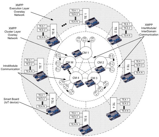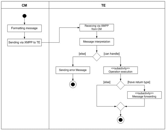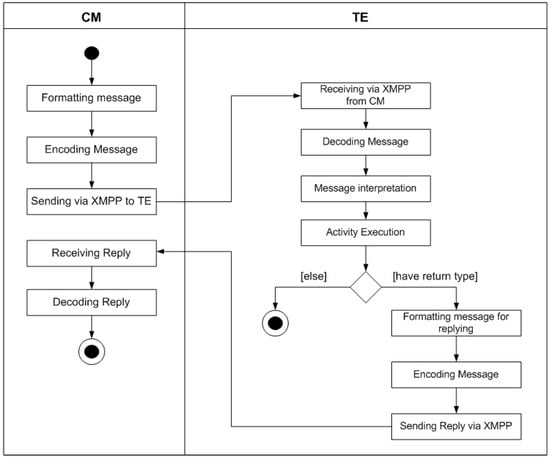 In order to implement the inter-module communication mechanism, an XMPP server must exist within the MOM4C domain and all its entities must be connected to the same XMPP room. The XMPP server can be directly installed in IoT devices. When a message has to be transmitted from the CM to an TE, as represented in Figure 3, it is formatted and then sent using XMPP. Once received, the message is checked from the TE, for verifying if the requested operation can be performed.