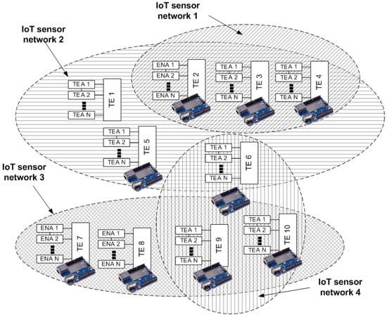 Considering an IoT scenario, CM nodes can be deployed in IoT devices such as Raskberry, Arduino, and so on. Whereas an EL represents an IoT sensor network. Thus MOM4C enables several simultaneous overlay sensor networks. TE nodes can be customized by means of the installation of external software agents exploiting the container technology that enables IoT devices to exploit a lightweight mechanism of virtualization []. TE nodes can belong to one or more ELs, i.e., they can belong to different IoT sensor networks. Such a concept is better explained in Figure 2. TE 2, 3, and 4 are IoT devices belonging to IoT sensor network 2. At the same time, TE 1, 2, 3, 4, 5, 6 belong to IoT sensor network 2. TE 7, 8, 9, and 10 belong to IoT sensor network 3. Finally, TE 6, 9, and 10 belong to IoT sensor network 4.