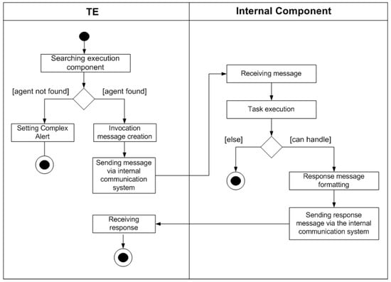 As depicted in Figure 3, two different situations could occur: if a request can be handled, it is performed sending eventually an answer to the CM (if a return value is expected), otherwise an error message will be sent specifying an error code. The “Execution Operation” is a sub-activity whose description is pointed out in Figure 4. When the sub-activity is performed, if any return value is expected the procedure terminates, else this value has to be forwarded to the CM in the same way it has been done previously with the request. The sequence of steps involved in the sub-activity is shown in Figure 4. If the operation that has to be executed involves a component different from the TE, the already described intra-module communication has to be employed. Once the selected component receives the message using this mechanism, if no problem occurs, the associated activity will be performed, else an error will be generated. If the operation is executed correctly and a return value has to be generated, the component will be responsible to generate the response message which will be forwarded to the TE, and thus, to the CM.