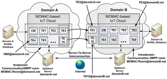 The two domains are identified by domainA.net and domainB.net identifiers. In a scenario without federation, they respectively manage different XMPP MUC for intra-domain communication (that are, mom4cRoom@domainA.net and mom4cRoom@domainB.net) on which a single CM, responsible for the administration of the domain, communicates with several TEs, typically placed within the physical cluster of the IoT Cloud domain. Considering a scenario of federation between the two different IoT administrative domains, if the CM the domainB.net domain needs external sensing and/or actuating resources, after an a priori agreement, it can invite within its mom4cRoom@domainB.net room one or more TEs of the domainA.net domain. For example, as depicted in Figure 5, the IoT Cloud of domainB.net rents from the IoT Cloud of domainA.net, TE6 and TE16. Thus, the two borrowed TEs will be physically placed in domainA.net, but they will be logically included in domainB.net. As previously stated, in order to accomplish such a task a trust relationship between domainA.net and domainB.net XMPP servers has to be established to enable a server-to-server communication allowing TEs of domain A to join the external XMPP MUC of domain B.