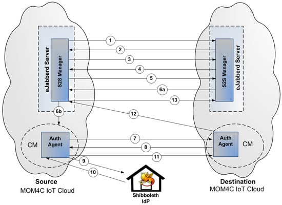 Let us consider two IoT Cloud providers each one relying on its own eJabberd XMPP server enabling the communications within the domain. Generally the server-to-server federation is accomplished by an eJabberd module that manages incoming and outcoming connections from/to external eJabberd servers. According to the XMPP core specification, this module is able to establish server federation according to the three different federation levels pointed out above. In order to enable eJabberd servers to perform SSO authentication the Encrypted Federation case has to be considered, extending the eJabberd module that performs SASL in order to add in the list of the supported security mechanisms also SAML 2.0. For simplicity, such a module was named Server-to-Server (S2S) Manager. A possible way for the achievement of this goal is the implementation of the Internet-Draft entitled “A SASL Mechanism for SAML” defined by CISCO TF-Mobility Vienna relying on an external software module based on Shibboleth, that was named Authentication Agent (AA). Considering the MOM4C architectural model, the AA is controlled by the CM node and acts as user when it is contacted from the S2S manger module of its domain for starting the IoT federation. On the contrary, it acts as relying party when it is contacted from another IoT Cloud provider. In the following, the sequence of steps performed by two eJabberd servers to establish a federated connection is described. As Figure 8 depicts, the involved actors in the process are the S2S Managers of both eJabberd servers, the two AAs respectively acting as user in the Source MOM4C IoT Cloud provider and relying party in the Destination MOM4C IoT Cloud provider. In this example, the Identity Provider is represented by the Shibboleth server.