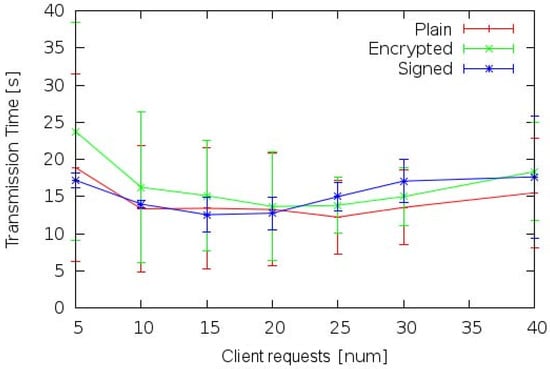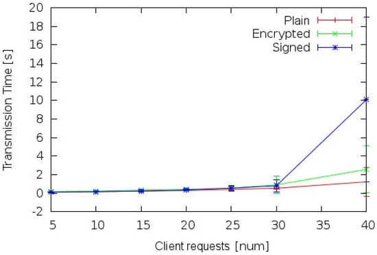Figure 10 shows the mean transmission time of messages exchanged between domain A CM and domain B TE devices. It was experienced that message signing and encryption overheads are minimal even considering 35 and 40 concurrent users’ requests with little differences between observed response times. In addition, in a few cases (considering 5, 15 and 20 concurrent requests), it is observed that the communication times of plain text messages are even slowly greater than the transmission times of signed messages. For example, considering 15 concurrent requests the transmission time of plain text is greater than the transmission time of signed messages of roughly 100 milliseconds. This anomaly is probably due to the internal concurrent management tasks performed by the adopted piece of middleware during experiments. The description of message management performed by the middleware is out of the scope of this paper (further details are available in []).