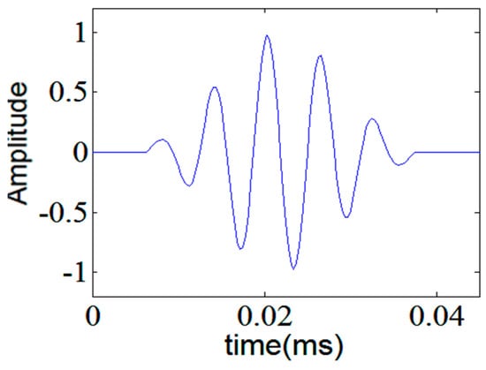 where s and l are scale and shift, respectively and W represents wavelet coefficients. By growing scale, the basis function is dilated; therefore, the corresponding coefficients give information about low frequency components of the signal, and vice versa []. It is worthy of emphasis that the success of Wavelet Transform or at least its best result depends on selecting a mother wavelet that maximally matches the shape of the signal that is being analyzed []. Considering the right choice of mother wavelet for a particular problem greatly enhances the outcome of the wavelet transform, one can not only choose a mother wavelet among standard wavelet functions but also tailor a function based on prior knowledge about the signal. For example, for guided wave signals a mother wavelet must be chosen or tailored in a way that, it has the maximum resemblance with the excitation signal. For excitation of guided waves in general, narrowband tone-burst signals are used. Tone-burst signal S(t) is simply a sine wave modulated by windows such as Hamming window: