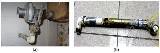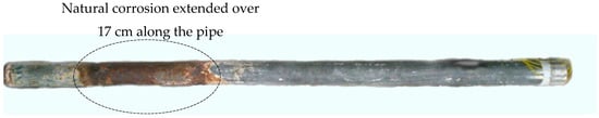 The in-service pipe used for the field test: the indoor portion of the pipe with rust starting at the entry of the concrete wall (a); and the corroded pipe with rusts after dissembled it from the concrete wall (b).