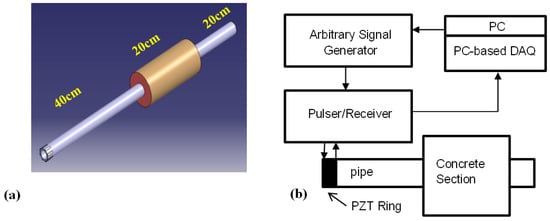 Concrete covered pipe (a); and schematic diagram of experimental setup; concrete covered pipe (b).