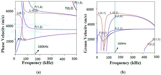 Phase (a); and group (b) velocity dispersion curves of the examined pipe.