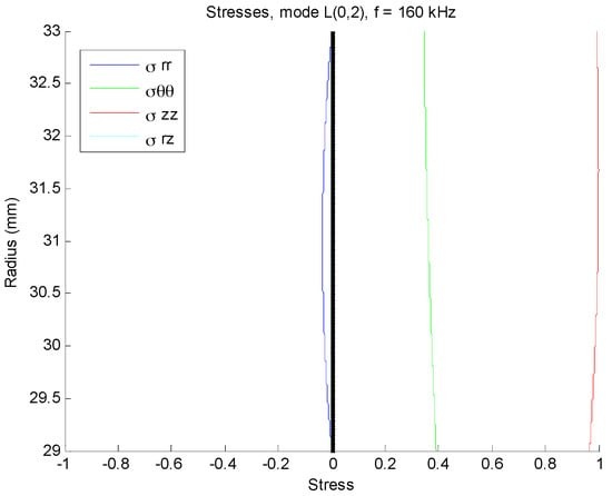 Both pipes were partially covered by concrete to simulate real concrete walls at residential buildings (Figure 3a). For the corroded pipe, the defective part was placed inside the 20 cm long concrete wall. Figure 3b illustrates a schematic diagram of our experimental setup. For the corroded pipe the concrete wall is located 48 cm away from one end which is 8 cm different from the normal pipe. An array of PZT strips was bonded at one end of the pipes to transmit and receive guide waves in pulse-echo mode. The strips are axisymmetrically distributed, so that longitudinal modes excitation is guaranteed and flexural modes are suppressed. L(0,2) mode in 160 kHz was preferred over the other guided wave modes because of its straightforward excitation and its less attenuation in comparison with torsional mode T(0,1) []. Lower attenuation, makes L(0,2) mode more feasible to inspect pipes buried in sand or covered by concrete. In this frequency, it is non-dispersive with the highest group velocity as depicted in the dispersion curves in Figure 4. PCdisp open source MATLAB toolbox which is based on Pochhammer-Chree dispersion equation is used to plot dispersion curves [,]. Meanwhile, with the aid of this toolbox we can observe that this mode has uniform stress distribution over the pipe wall thickness. Figure 5 demonstrates the stress filed of L(0,2) at 160 kHz. The uniform stress distribution makes the L(0,2) equally sensitive to any change; regardless of their radial positions in the pipes’ wall thicknesses. For the excitation of L(0,2) mode at the selected frequency five-cycle tone-burst signal modulated by Hamming window was delivered through an arbitrary signal generator and generated by an RITEC 4000 pulser & receiver (RITEC Inc., Warwick, RI, USA):
