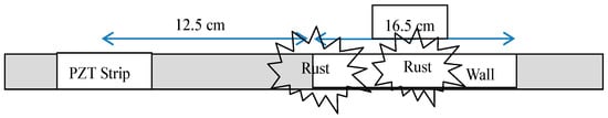 In Stage 2, we repeated the experiment on pipes carrying gas to residential buildings in Hong Kong. Similar to the experiment conducted in our lab, a strip of PZTs was mounted on a pipe that was passing through a concrete wall (Figure 7). For the pipe with corrosion, rusty portion was started at the entry of the concrete wall and extended all the way to the portion of pipe that was covered by the concrete wall. However, there were two areas in which the corrosion was severe: the entry of the concrete wall and an area right before the end of the concrete wall. Figure 8 demonstrates the schematic diagram of our setup with the location of most severe part of the corrosion on the pipe. After completing data collection, the in-service corroded pipe was replaced with a new and normal pipe. The data collection process was repeated again on this normal pipe for comparison purpose.