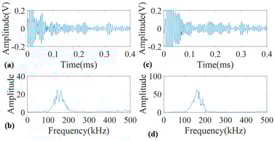 Guided wave signals measured at 160 kHz for concrete covered pristine pipe (a) with its FFT (b); and concrete covered corroded pipe (c) with its FFT (d).