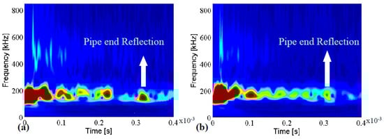 To find the localized frequency components of the signals, wavelet was used to draw their time-frequency representations (TFRs). Figure 10 demonstrates continuous wavelet transform of the signals in Figure 9 by adopting complex tone-burst wavelet. As can be seen in Figure 10, the two TFRs look very similar and not only cannot we locate the concrete wall but there is large amount of ambiguity about the existence of the defect. This problem occurs because of many overlapping modes coming with the environmental contamination. Nevertheless, despite the difficulty in extracting the critical information, detecting the pipe ends at 0.31 ms is possible. The simplicity in detecting the end is because of the fact that the end acts as a block that reflects all the energy back towards the incident point.