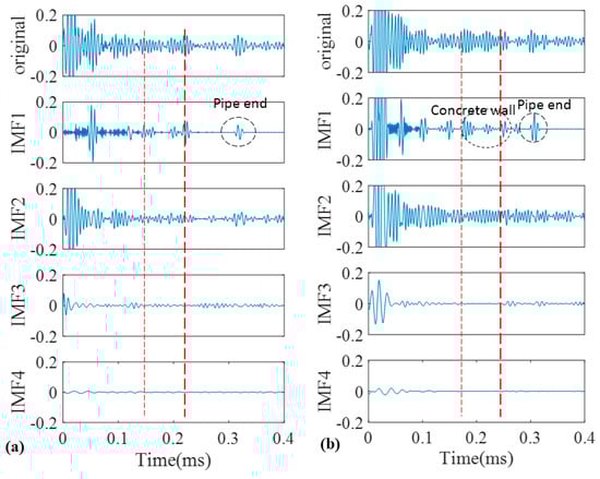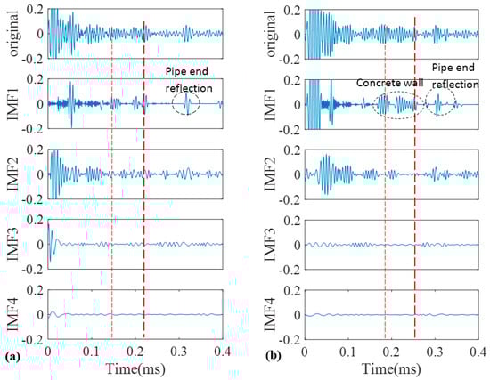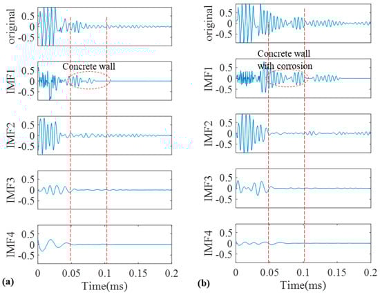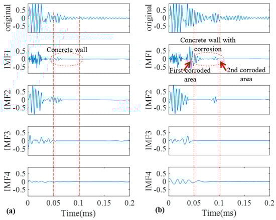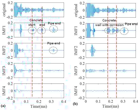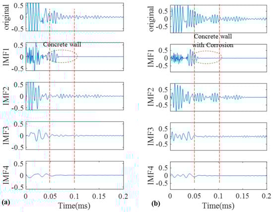 As a good candidate to decompose a non-stationary signal into its intrinsic mode functions, we firstly adopted conventional EMD for our recorded signals. The signals obtained in Figure 9 were decomposed into different IMFs according to the algorithm that was explained in the earlier section. The original signals of the pristine and corroded pipes together with their IMFs are demonstrated in Figure 11a,b, respectively. Two vertical dashed lines passing through all IMFs indicate the location of concrete wall on time axis according to Table 1.