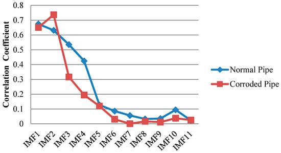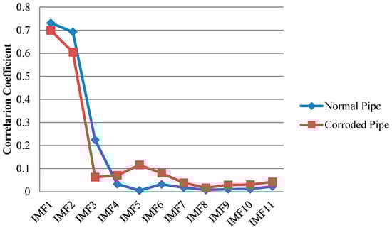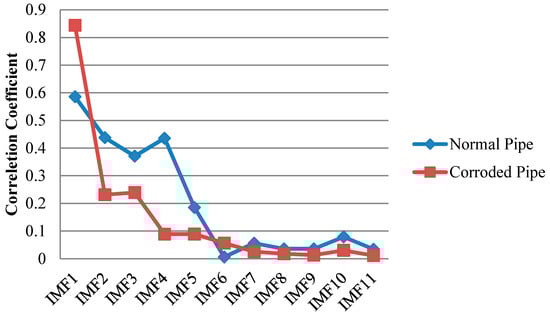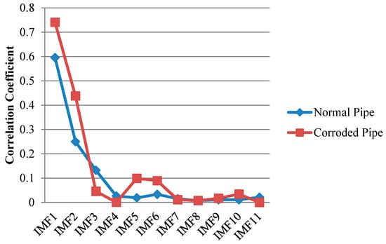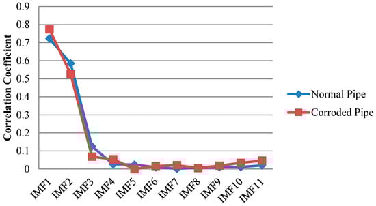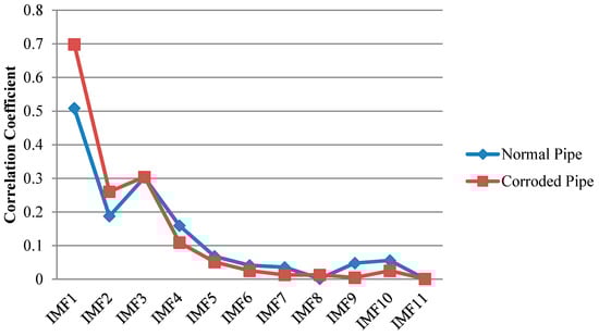 Similar to EMD, cross correlation was used to find which IMFs for both pipes contain the critical information. As can be observed in Figure 13, comparable to the results of EMD, IMF1s include much information about the critical features of the pipes as their features can be somehow spotted in the first IMFs. This is in an agreement with the correlation results in Figure 14 which means IMF1s have the most relevant embedded information. The reflections from the far end for both pipes are exposed in IMF1s. In addition, while the concrete wall is separated for the corroded pipe, in the normal pipe IMF1 still have many overlapped components. Meanwhile, for corrosion detection, comparison study between the second IMFs does not provide useful and clear information.