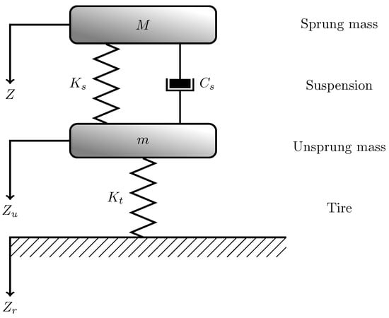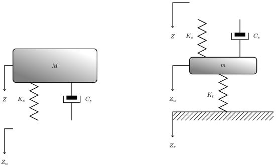 In Figure 1, M is the sprung mass (above the suspension system) and Z is its level. is the stiffness and is the damping constant of the suspension that connects M to m, where m is the unsprung mass (above the tire and below the suspension) and is its level. is the stiffness of the tire. Eventually, is the ground level. The model, which is related to a single suspension, is known as “Quarter-car model” []. The suspension system has a mathematical model which can be solved using the Newton’s second law.