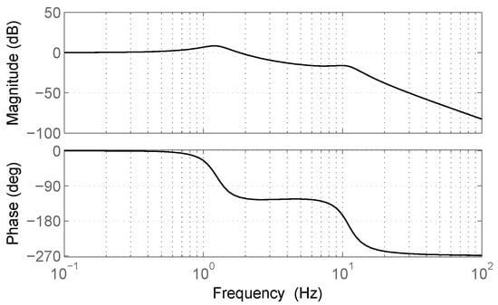 Table 1 shows that all parameters (with the exceptions of Allison []) have the same order of magnitude. Thus, the parameters give very similar frequency responses. In the following, for simplicity sake we will refer to the coefficients A, B, C, and D computed with the parameters provided by Gillespie ([] Figure 5.25, p. 163). The resulting frequency response is reported in Figure 3. The system has the behavior of a low-pass filter with a cut-off frequency around 2 Hz.
