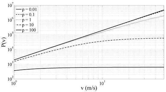 Figure 4 shows the behavior of for five different orders of magnitude of pole p. For low values of p or for low speed values, increases by 20 dB/decade. On the contrary, when p or v become very large, tends to a constant. This behavior can also be explained from (3). Let us consider , such that