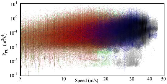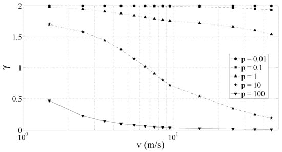 with the exponent γ that is expected to fall in the range . As a matter of fact, Figure 5 shows the value of γ obtained from , for different values of the pole p and at different vehicle speeds v. The values of γ have here been computed with a linear fitting of since, according to (10),