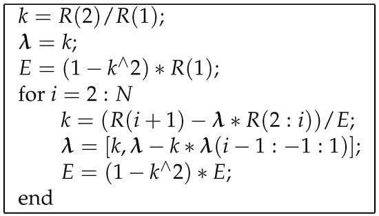 In order to compute the prediction filter and the prediction error, a block based approach is applied: the signal is split in segments of length M, with M sufficiently large to have an accurate estimate of the prediction filter and, at the same time, sufficiently small to be able to consider the signal stationary. The prediction filter is computed with the Levinson–Durbin recursion [,], whose pseudo-code is reported in Figure 6. Regarding this algorithm: denotes the vector collecting the first N terms of the autocorrelation of estimated over a segment (with ); is the prediction filter coefficient vector; E is the mean square prediction error (i.e., the energy of the prediction error signal).