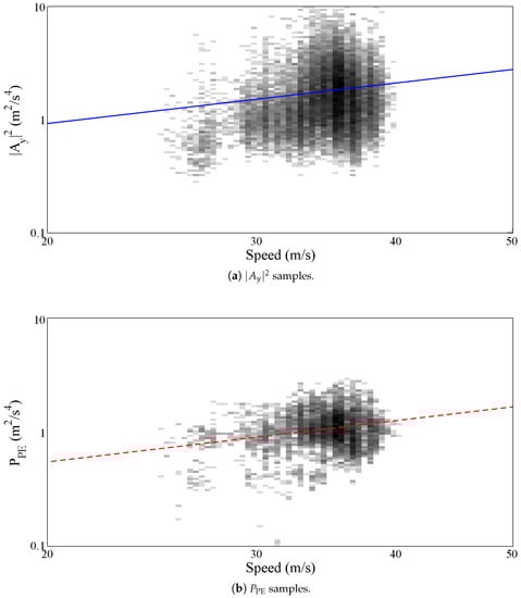 During this experiment the vehicle collected 2,485,800 acceleration samples which have been used to calculate the on a window of 100 samples. Figure 7 shows both the collected vertical acceleration (Figure 7a) and the calculated (Figure 7b). To increase the figure readability the large amount of samples have been plotted using a 2D frequency histogram obtained by dividing both the x and the y axes in 200 intervals. The color depth was set to 8 bit, thus resulting into 256 grey levels. The intervals belonging to the class with the largest number of points have been colored in black. The intervals with no points have been colored in white. The other intervals have been colored in different shades of grey according to their number of points, the larger the number the darker the shade. In both graphs the gamma law, calculated according to (10), is also plotted. As expected the collected points are distributed in a short speed range starting from about 25 m/s until about 40 m/s.