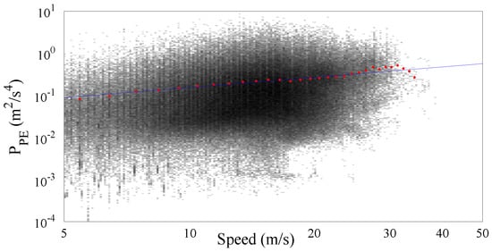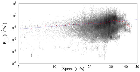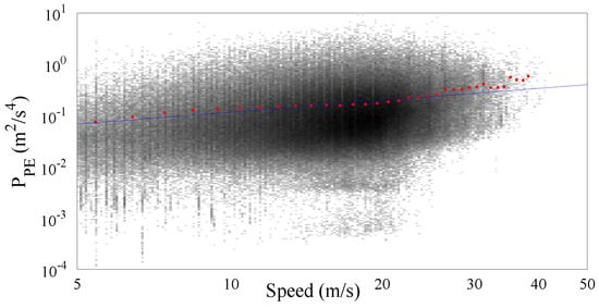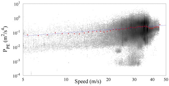 Figure 8 shows more than 476,000 samples collected along the Italian motorways by the SmartRoadSense project. In particular, all the data extracted from the database and related to the motorways cluster have been sorted according to the value of speed and, as in the previous experiments, they have been processed to obtain a 2D frequency histogram which is then represented by means of a gray scale. For each class of speed then the average value has also been calculated and plotted as a red point together with the best fit obtained using the gamma law (blue line). The resulting frequency histogram is also shown in Figure 9 which highlights the short range of significant speeds starting approximately from 20 m/s until 40 m/s. The resulting value of the gamma law is characterized by a of about and a γ of about .