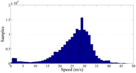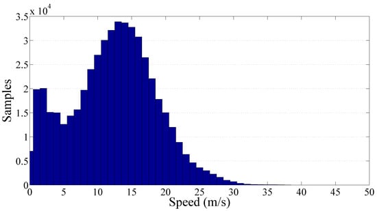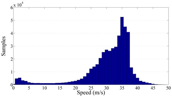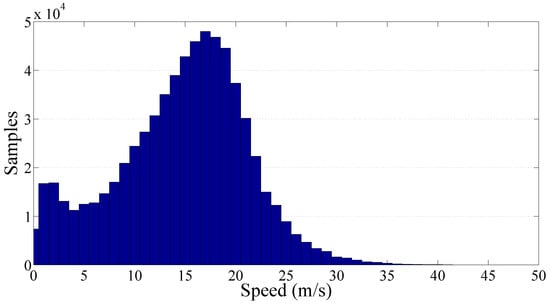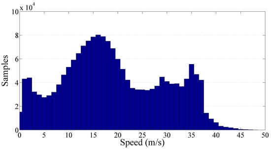 The results obtained by processing the primary roads cluster, which contains more than 677,000 samples of , are presented in Figure 12 and Figure 13 showing an increase of collected samples in the low speed ranges and a reduction in the high ranges which leads to a range of significance of the speed starting from about 5 m/s until 30 m/s. The resulting value of the gamma law coefficients and γ are respectively and .